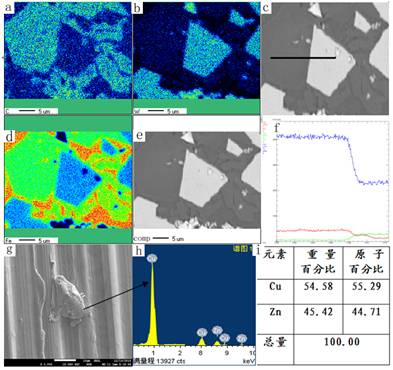 图c,f为碳、钨和铁、元素的线扫描图;图g,h,i为黄铜的点分析