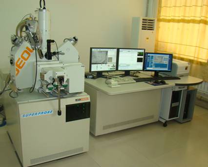 JXA-8230型电子探针,日本电子公司生产,购于2010年6月,主要附件为能谱仪350。主要技术参数:二次电子分辨率6nm,波谱通道数3CH,分析元素范围B-U,加速电压范围0~30kV。探针电流范围10-12-10-5A。