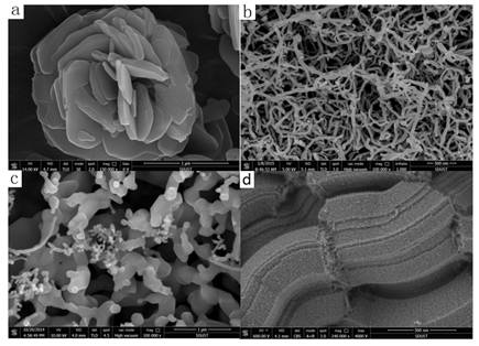 a:水滑石;b: CNTs(碳纳米管); c:TiC-CNTs; d:分子筛