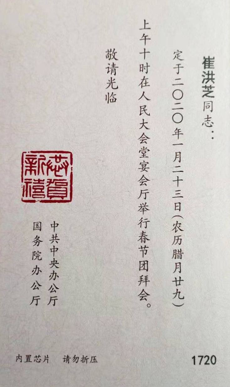 一元周复始,万象景更新。2020年1月23日上午,中共中央、国务院在人民大会堂举行2020年春节团拜会。中共中央总书记、国家主席、中央军委主席习近平发表重要讲话。党和国家领导人李克强、栗战书、汪洋、王沪宁、赵乐际、韩正、王岐山等出席团拜会,李克强主持。我院崔洪芝教授作为科技界代表受邀参加了中央2020年春节团拜会。