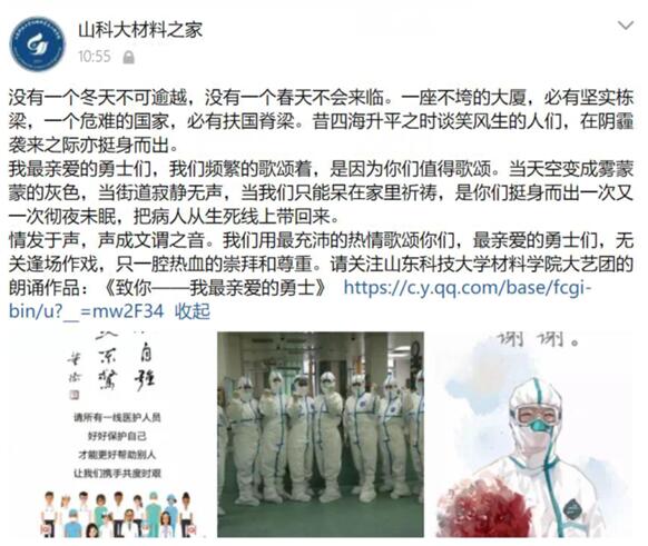 2020年注定是值得所有人铭记的一年。为了致敬抗击疫情的英雄们,必赢3003no1线路检测中心学生会大艺团献唱歌曲《武汉不孤单》、朗诵短诗《致你——我最亲爱的勇士》,以表达对英雄的敬仰。