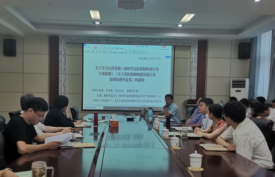 申兆亮结合《新时代师德规范》、《新时代高校教师职业行为十项准则》、《关于高校教师师德失范行为处理的指导意见》《必赢3003no1线路检测中心教师师德考核办法》等师德师风建设相关文件对全体教职工进行宣讲,重点从思想政治方面、学术道德方面、教育教学方面、生活行为方面、廉洁自律方面等讲解了必赢3003no1线路检测中心师德负面清单,并结合违反高校教师职业行为十项准则典型案例对师德失范行为处理进行了深入剖析。
