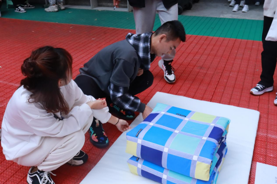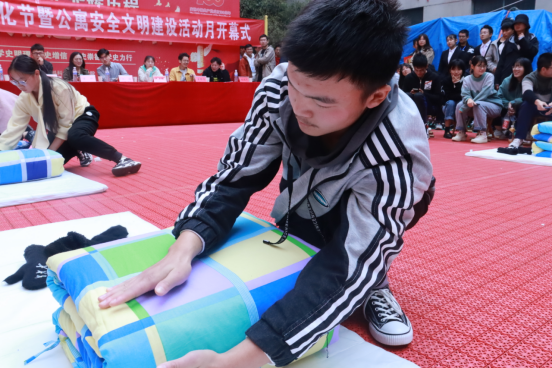 动员会后,叠被大赛正式开始。叠被大赛共分为个人普通叠被、双人游戏叠被、道具叠被以及趣味游戏四个环节,总共十一支队伍参加。同学们赛前口号响亮,人人斗志昂扬,赛时动作行云流水,队员沉着冷静。最终经过激烈的角逐比拼,决出一等奖1名、二等奖2名、三等奖3名、优秀奖5名、最佳班级文明风貌奖1名。