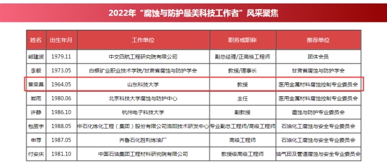 近日,中国腐蚀与防护学会下发决定,授予熊建波等8位同志2022年腐蚀与防护最美科技工作者称号。其中,我院曾荣昌教授获此殊荣。