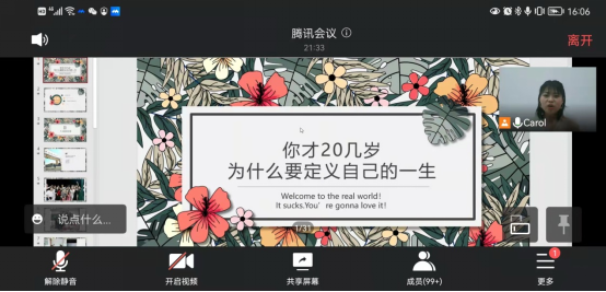 3月24日下午,必赢3003no1线路检测中心举办第40期校友论坛,学院2018届材料化学专业毕业生王洁以“你才20几岁,为什么要定义自己的一生”为题进行交流分享。本次论坛通过腾讯会议线上进行,学院学工办主任/团委书记马韶霞、辅导员薄艳艳和部分本科生、研究生参加。