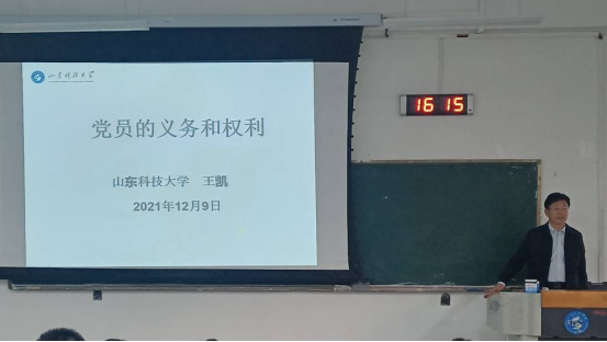12月9日,艺术学院党委书记王凯讲述了《党员的义务和权利》的主要内容,他分别介绍了党员的八项义务和八项权利,强调党员义务和权利的关系是相互依存、相互联系、相辅相成的,二者统一于党性之中。每个共产党员都应该严格、自觉地履行党员义务,合理、规范地行使党权利,不断增强党性修养。