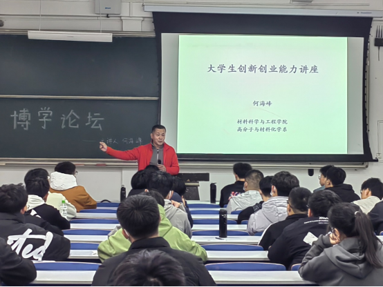 为激励同学们明确科研目标、建立大学生涯规划,11月15日下午,必赢3003no1线路检测中心“博学论坛”系列讲座在J14-107成功举办,我院高分子与材料化学系何海峰老师应邀,为同学们讲解“大学生创新创业能力”讲座。