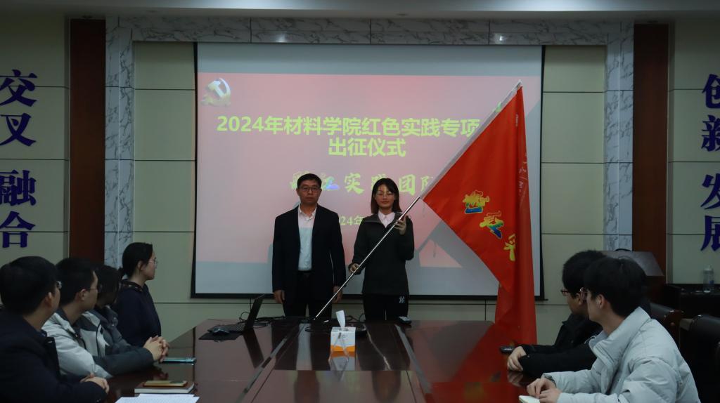 出征仪式上,学院党委书记申兆亮为彩红实践团队授旗并讲话,他充分肯定了彩红实践团队在红色实践活动中取得的成绩,勉励同学们在深入学习中国共产党的历史中认真领会“两个结合”的深刻内涵,在红色实践中坚定初心践行使命,用红色精神引领自身学习和科研实践,带动更多青年大学生将更多优秀成果和论文写在祖国大地上。