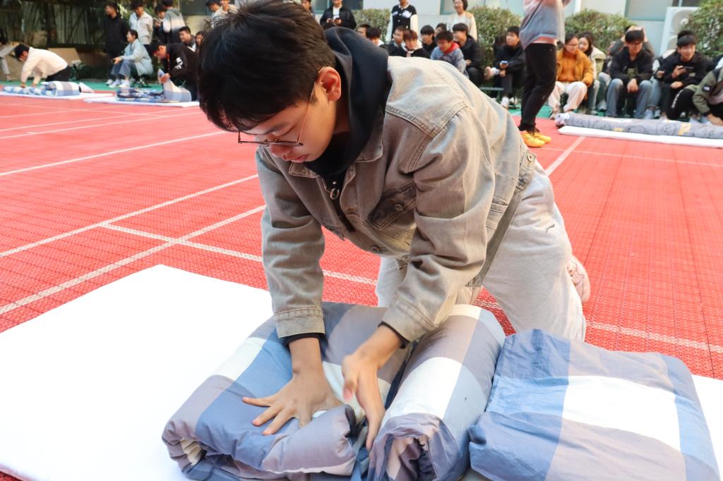 开幕式结束后,叠被能手大赛正式开始。大赛分为“打好行囊上战场”、 “好朋友,一起来”、 “道具抽不停”等环节,共十支队伍参加比赛。各班同学赛前口号响亮、斗志昂扬,参赛选手全神贯注、拼尽全力,拉拉队热情似火,加油呐喊声此起彼伏。经过激烈的角逐与比拼,最终金属四班获得一等奖,金属三班、高分子三班获得二等奖,金属一班、高分子一班、高分子二班获得三等奖,金属二班、高分子四班、新能源一班、新能源二班获得优秀奖。