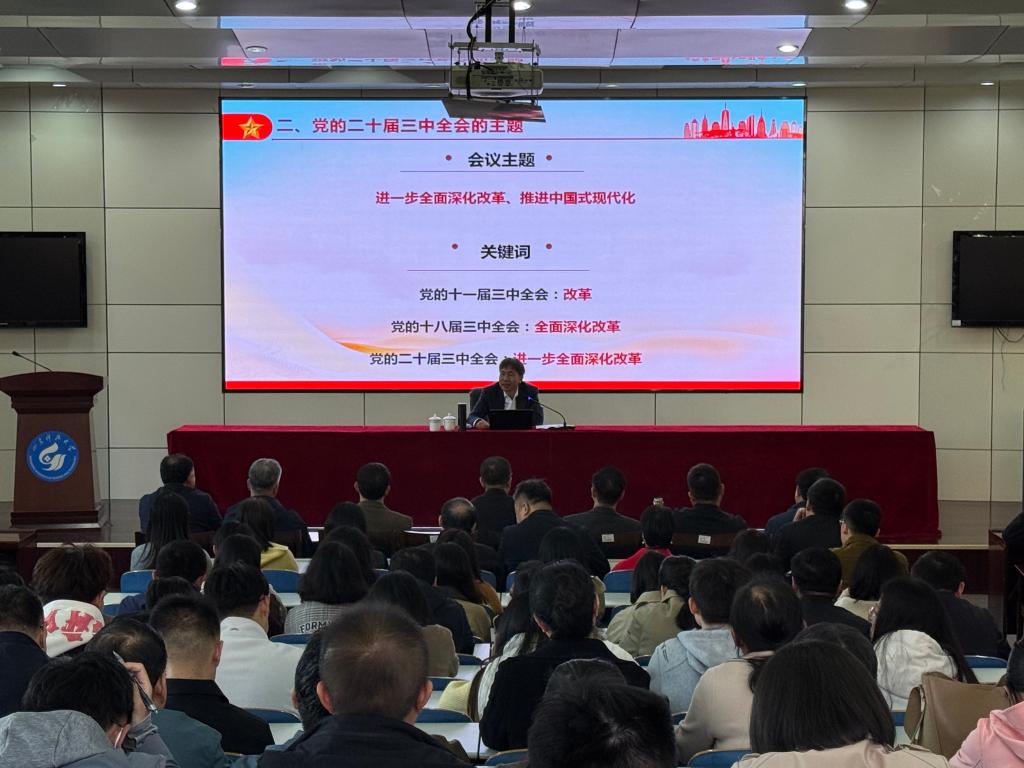 薛庆忠以党的二十届三中全会的重大意义为切入点,介绍了全会主题及主要内容,引领师生学习了全会提出的进一步全面深化改革的总目标和“六个坚持”重大原则,用“七个聚焦”集中阐述了总目标的要求,详细解读了《中共中央关于进一步全面深化改革推进中国式现代化的决定》中关于经济、政治、文化、社会、生态文明、党的建设等重大举措。他指出,要迅速把思想和行动统一到全会精神上来,把智慧和力量凝聚到全会确定的目标任务上来,全力推动全会精神入脑入心,切实用全会精神统一思想、指导实践,抓好核心要素,用好硬招实招,全力推动学校各项事业高质量发展。