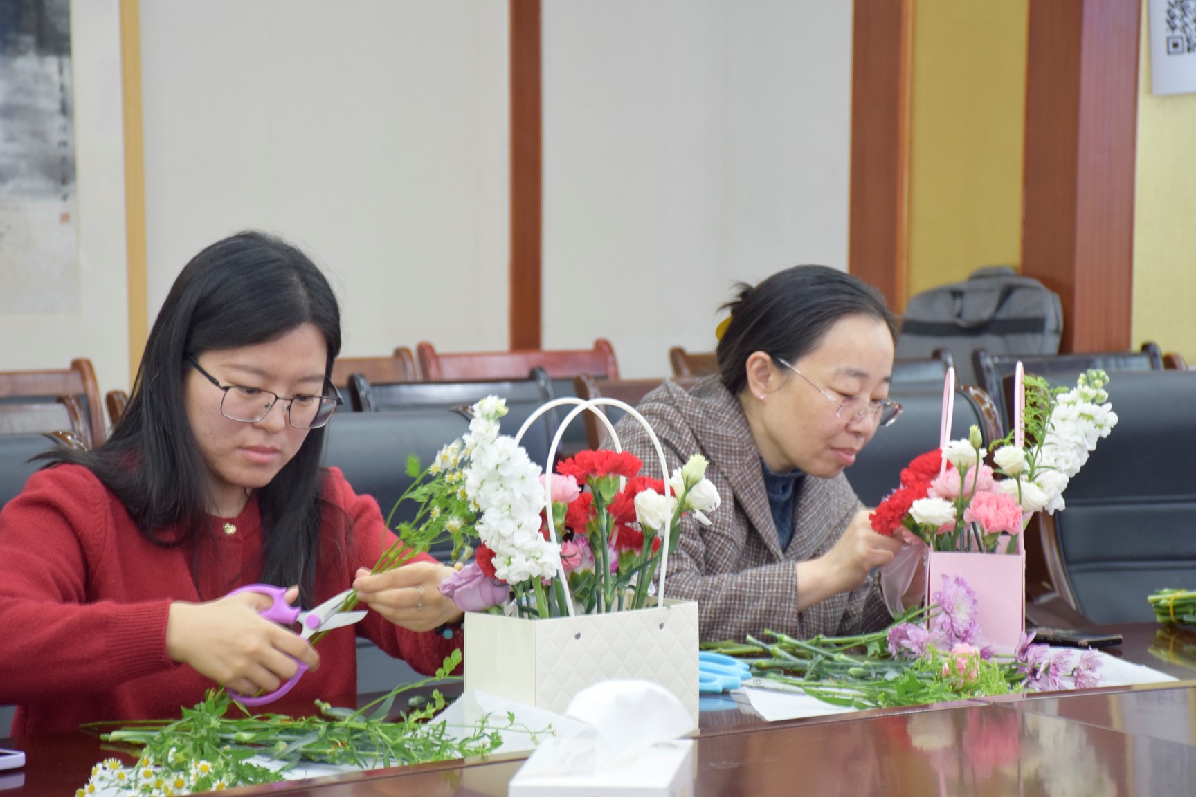 各位老师在专业指导下,学习了插花的基本技巧,包括色彩搭配、花材选择以及造型设计等方面的知识。活动现场花香四溢,笑语盈盈。经过老师们的努力,一盆盆独具匠心、色彩斑斓的插花作品呈现在大家面前。这些作品不仅展现了女教师们对美的独特理解和追求,也蕴含着她们对生活的热爱和对未来的美好祝愿。