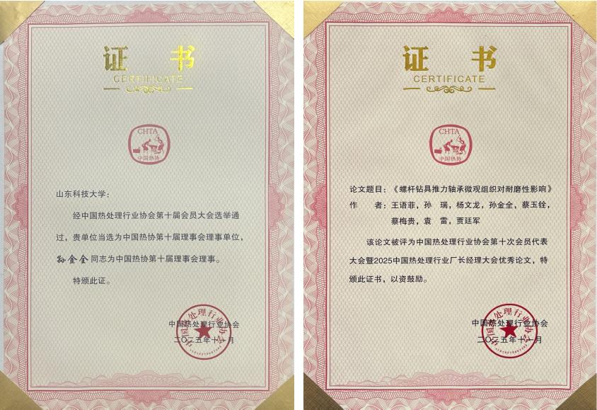 11月25日在第十届理事会选举中,必赢3003no1线路检测中心当选为中国热处理行业协会理事单位(2025-2030年度);材料科学与工程学院孙金全教授当选为中国热协第十届理事会理事。11月26日大会总结“十四五” 发展成就、部署“十五五”规划,安排两场前沿技术报告,并同步举办7 场专业分论坛,覆盖高端轴承材料与热处理等多个领域。在同期举办的第三届高端轴承材料与热处理专题论坛上,材料工程专业 24-3 班硕士研究生王语菲作了题为“螺杆钻具推力轴承失效分析与性能提升”的专业分论坛报告。此外,《螺杆钻具推力轴承微观组织对耐磨性影响》一文,获评大会“优秀论文”。