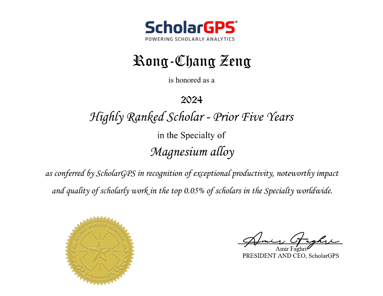 近日,国际学术机构ScholarGPS发布了2024年度全球前0.05%顶尖学者/科研机构榜单,分为终身榜单(Highly Ranked Scholar - Lifetime)和近五年榜单(Highly Ranked Scholars- Prior 5 Years)两个类别。