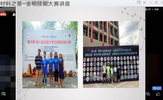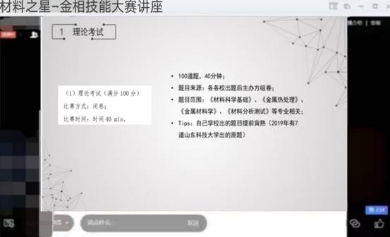 4月18日晚,必赢3003no1线路检测中心通过腾讯会议举办了材料之星金相技能大赛线上讲座。曾获全国高校大学生综合技能大赛特等奖的金属16-1班梁艳同学应邀分享了参赛心得和备赛方法,学院部分本科生同学参加。