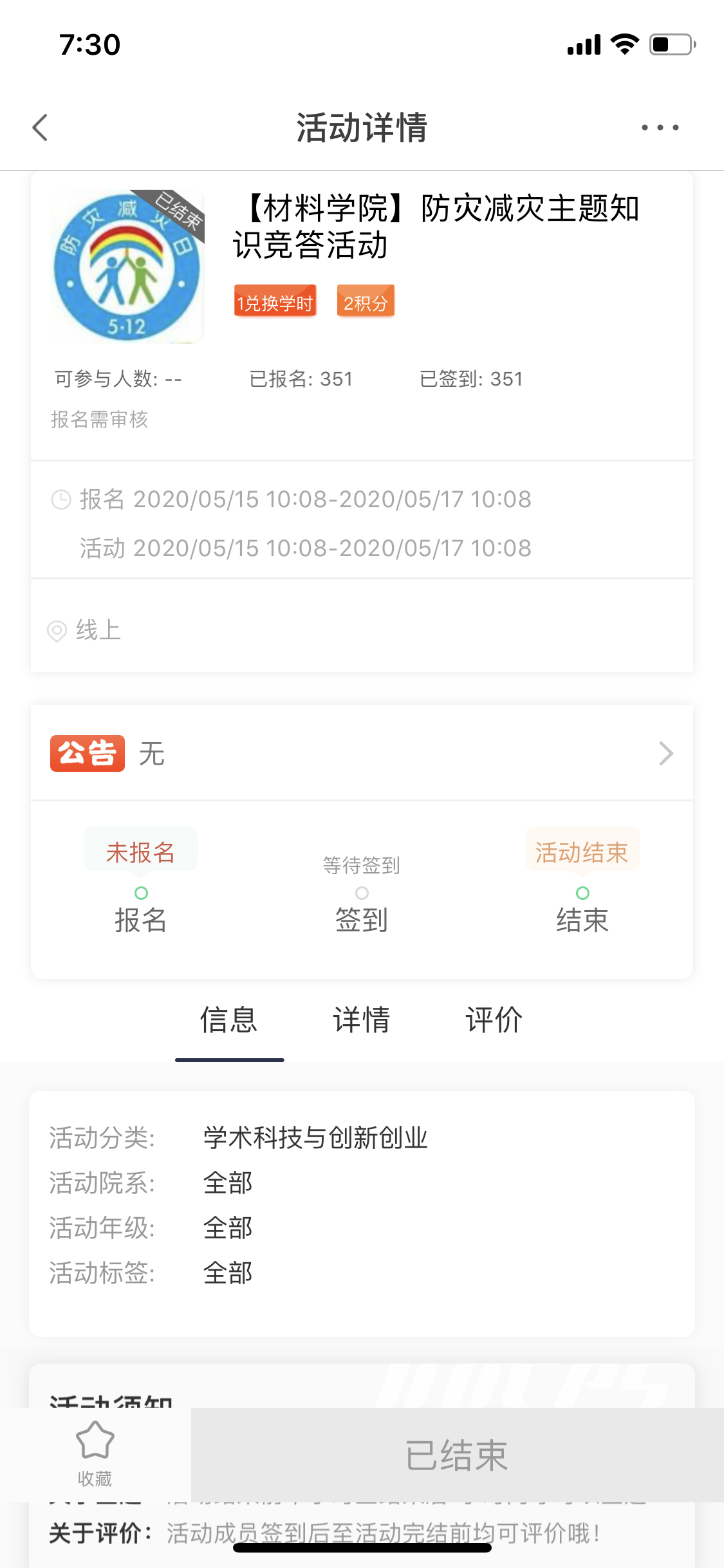 本次活动共有350余名同学参加。竞答题目设置单选题、多选题和判断题,内容涵盖了地震基本知识、自然灾害监测系统知识、灾害应急避难知识等。经统计并审核答题情况,最终无机17陈智桦获得一等奖;金属19-4唐乃洋、应化19-2曲慧敏、金属19-5扈如浩获得二等奖;金属17-1王炜康、高分子19-3魏亚宁、新能源18宋明慧、高分子19-3李振洋、物流19-1曹钰获得三等奖。