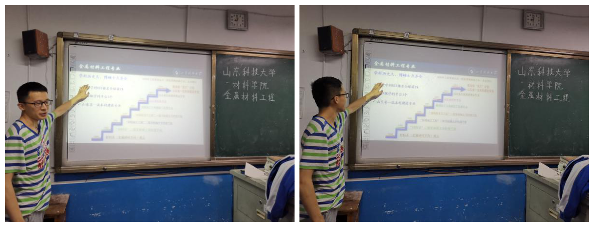 个人实践中毕若一来到高中母校山东省宁阳第二中学,邀请了十八名成绩合适的应届高中毕业生回到母校,通过PPT分别详细介绍了学校、学院及金属材料工程专业的招生简介。分析了金属材料工程的研究方向和就业前景,又向同学们展示了学院的研究设备和师资力量,最后从自己的角度介绍了丰富多彩的大学生活,并为同学们提供力所能及的帮助。